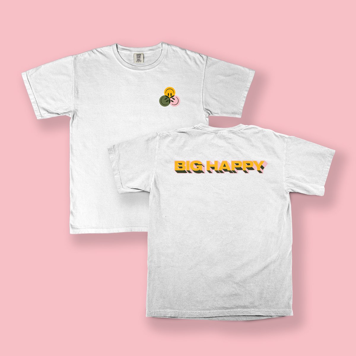 Full color "Holy Trinity" logo printed on front and "Big Happy" logo on back of a white, 100% ringspun cotton, Comfort Colors heavyweight t-shirt. Shipping is free on all orders.